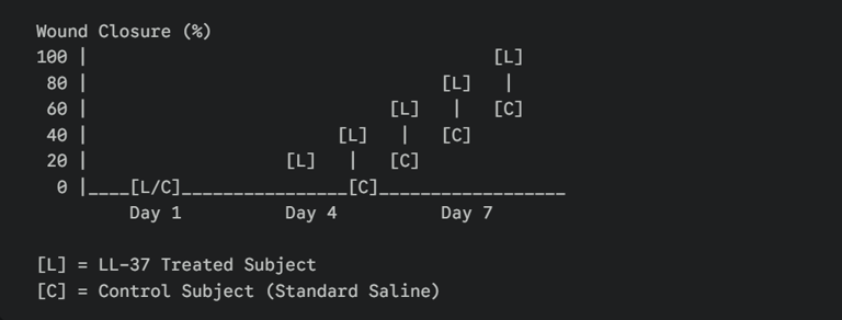 This chart demonstrates the timeline of epithelial tissue repair in subjects treated with LL-37 versus a standard control group.